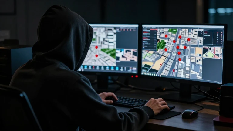 Ilustrasi serangan siber: hacker menyusupi jaringan CCTV kota untuk memantau aktivitas secara real-time.