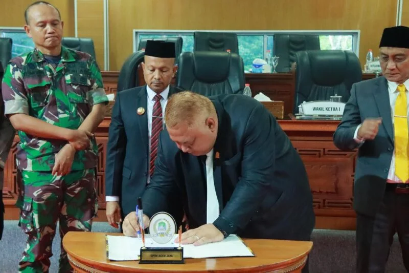 Bupati Aceh Jaya Safwandi bersama pimpinan DPRK menandatangani nota kesepakatan di ruang rapat paripurna, menandai komitmen bersama melaksanakan RPJMK dan perubahan KUA-PPAS 2025.